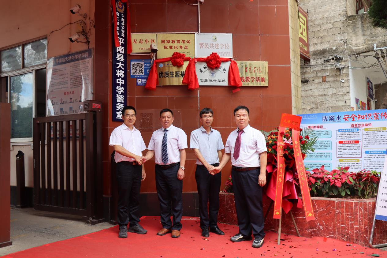 FUN乐天使官方网站党委书记庞伟、生物与制药学院院长贝永建和平南县大将中学党支部书记方佐科、校长汪国雄共同为玉林师范学院优质生源基地、实践教学基地揭牌。