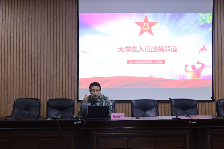 会议伊始,牛建明老师就当代征兵的条件与福利进行展开宣讲,鼓励学生积极踊跃参军,利用一切机会,学习本领、练就品格、强大精神、锻炼军事技能,并把这段经历当成人生的宝贵历程。牛建明老师强调唯有自身强大,才能在保家卫国的征程上,成为坚不可摧的城墙。最后他希望同学们能够增强职责使命,勇担历史责任,树牢“请党放心,强国有我”的决心,用优异成绩铸就报国之行,为实现中华民族伟大复兴的中国梦不懈努力。