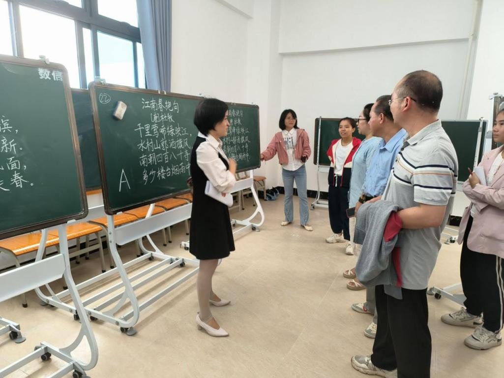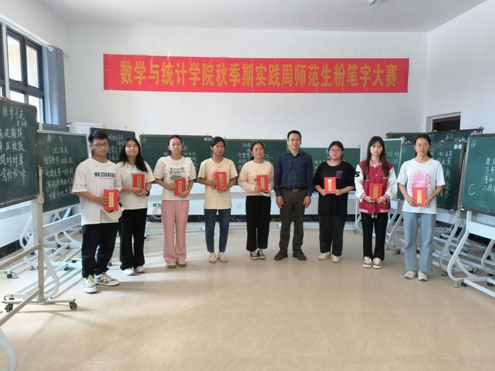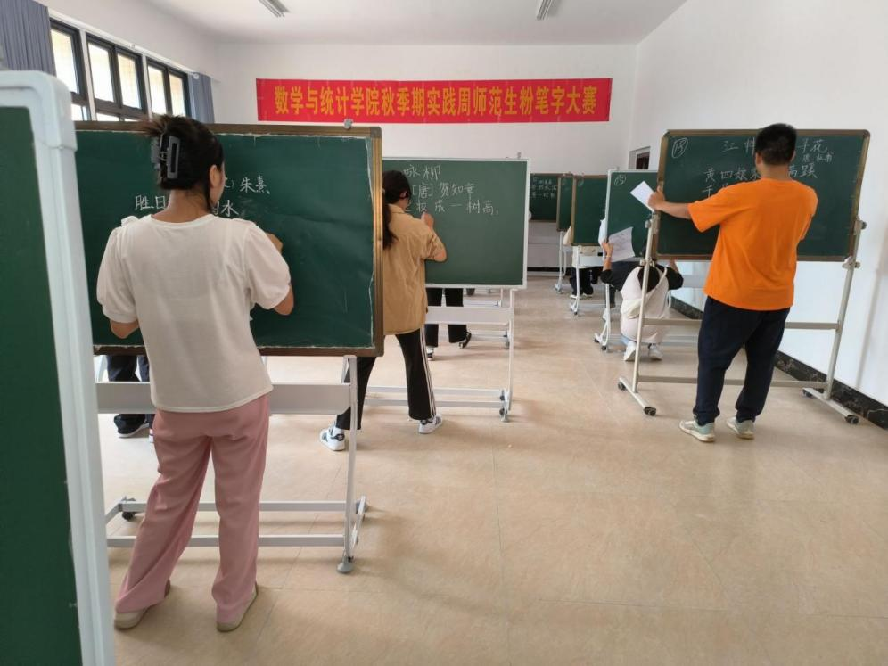 为加强师范生教学技能,提高师范生创新能力、教学能力和就业能力。11月2日,数统学院于粉笔字练习室举办2023年实践周师范生粉笔字比赛。本场比赛由数学与应用数学2023级全体学生参赛,冯瑜等六位教师参与评选打分。