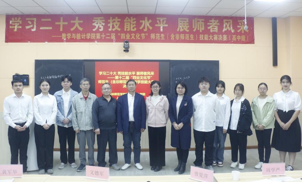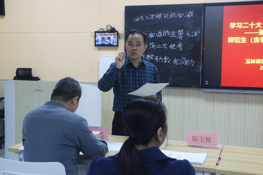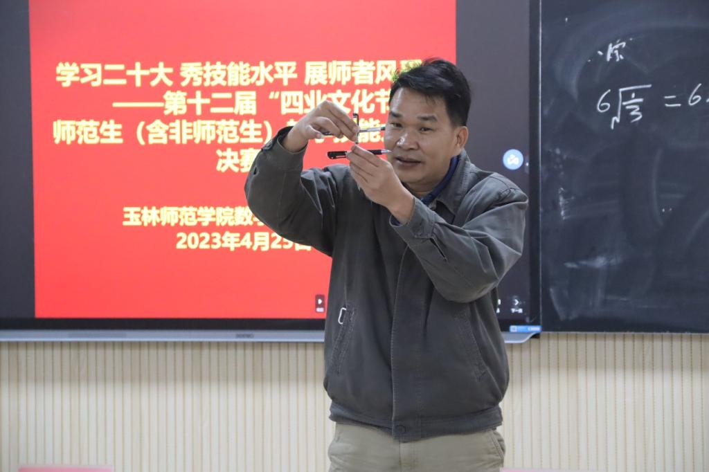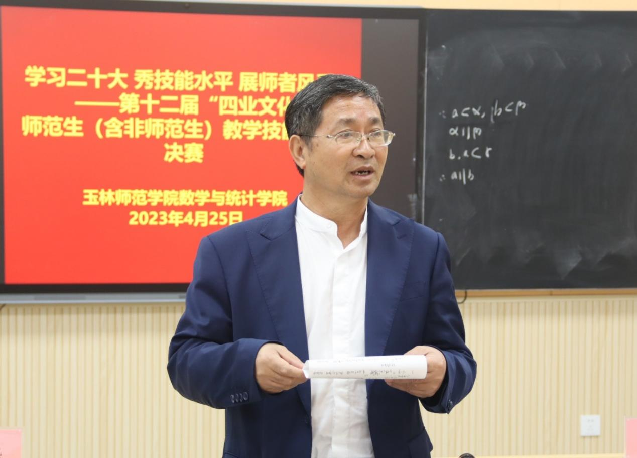 为进一步增强师范生(含非师范)的实践能力和创新能力,强化师范生(含非师范)专业技能。4月24日25FUN乐天使官方网站于FUN乐天使官方网站东校区新民楼C102、C104、C203举办第十二届“四业文化节”师范生(含非师范)教学技能大赛院级决赛。学院党委书记庞伟、副院长王培(全面主持行政工作)、副院长杨京开等领导出席本次比赛,玉林市玉东一中莫罕瑞天立高中文德君等中学一线教师以及我院数学骨干教师担任比赛评委。比赛以线上线下同步结合的方式进行,1000余人参与观摩。